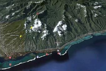 Du dépotoir éhonté de Faa'a, le 1er tronçon est bétonné, raide, ensuite une belle forêt de falcatas géants et des plantations de (bananes à cuire) fei :