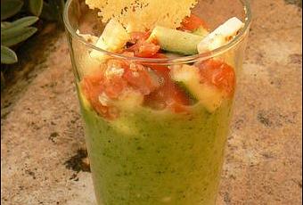 Epépiner la courgette, couper en dés et cuire avec un peu d'eau en réservant quelques dés crus. Une fois tendres, mixer avec les feuilles de menthe et 1 cs de gomasio. Répartir dans des verrines.