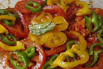 Couper les tomates et poivrons en rondelles, et les mettre dans un plat allant au four.