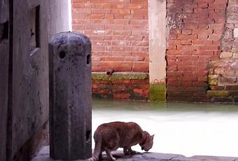 Une rencontre imprévue du côté de Carampane avec Medoro le petit chat roux ...J'avais marché toute la matinée sous un soleil de plomb, recherchant les zones d'ombres.Fatiguée j'avais rejoint mon quartier, fuyant comme à l'accoutumée les calli passagères et empruntant les petites ruelles pour passer d'un pont à l'autre de S'Polo à S'Croce, quand subitement quelque chose attira mon regard... hop ! deux pas en arrière. Au bout d'une impasse sombre, un superbe suriàn roux rampe sur le sol, s'immobilise, se fond dans le décor, ses gestes sont lents, mesurés !Mes yeux ne sont pas aussi perçants que les siens et là bas la lumière brille sur l'eau. Il est à l'affût...mais de quoi ? J'aperçois enfin l'objet de son intérêt : une tête blanche et ronde, un oeil vif et un bec crochu. C'est tout, la bestiole (un gros goéland) doit se trouver quelques marches plus bas sur le bord du rio.Vite mon appareil, la scène est extra ! Zut, je n'ai plus de batterie, vite un échange standard !Je relève la tête, je n'ai qu'une crainte, c'est de voir Medoro faire un plongeon dans le rio avec le volatile qui est bien plus grand que lui ! L'oiseau a disparu, je n'ai rien entendu, pas un bruit de battements d'ailes, il n'y a que le chat qui renifle les lieux, aussi médusé que moi ... d'ailleurs il vient vers moi, il n'a pas l'air de bon poil !Je m'approche, il est mignon, il se laisse caresser, il a besoin d'un petit réconfort, il en profite pour se venger un peu en me mordillant les doigts. Sympa il se prête volontiers à la pose et c'est là que j'ai pu lire son nom sur la médaille accrochée à côté du grelot de son collier rouge.Il jette encore un regard vers le rio, mais le goéland a du rejoindre la Pescheria toute proche à "vol d'oiseau" !!!