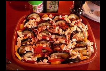 Graisser à l'huile d'olive un plat à gratin puis ranger les tranches de légumes en les alternant de façon régulière, bien serrées et debout. Choisir 125g de fromage de chèvre pas trop dur et l'émietter à la fourchette. Disposer le fromage sur les légumes, saler , poivrer, saupoudrer de feuilles de thym et de piment d'Espelette. Verser un mince filet d'huile sur le tout.