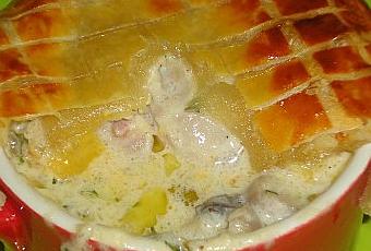 1 poulet coupé en huit morceaux sans les abats-une pâte feuilletée-150 g de lard (poitrine demi-sel)-4 échalotes-250 g de champignons de