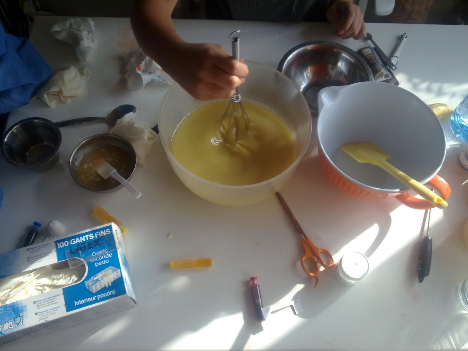 Nous voilà donc chez cette chère voisine, dans sa cuisine... Avec tout l'attirail : les huiles, les beurres, la soude caustique, l'eau, les colorants alimentaires (test du jour), les oxydes minéraux (au cas où), des arômes alimentaires, les récipients, les moules, les spatules, les gants, ... Mais aussi pas loin le vinaigre d'alcool (en cas de projection sur la peau, il neutralise la soude caustique), une pêche, du miel, de la crème fraîche, une banane et je ne sais plus trop quoi comme ingrédient à ajouter, parmi lesquels les filles devront choisir...