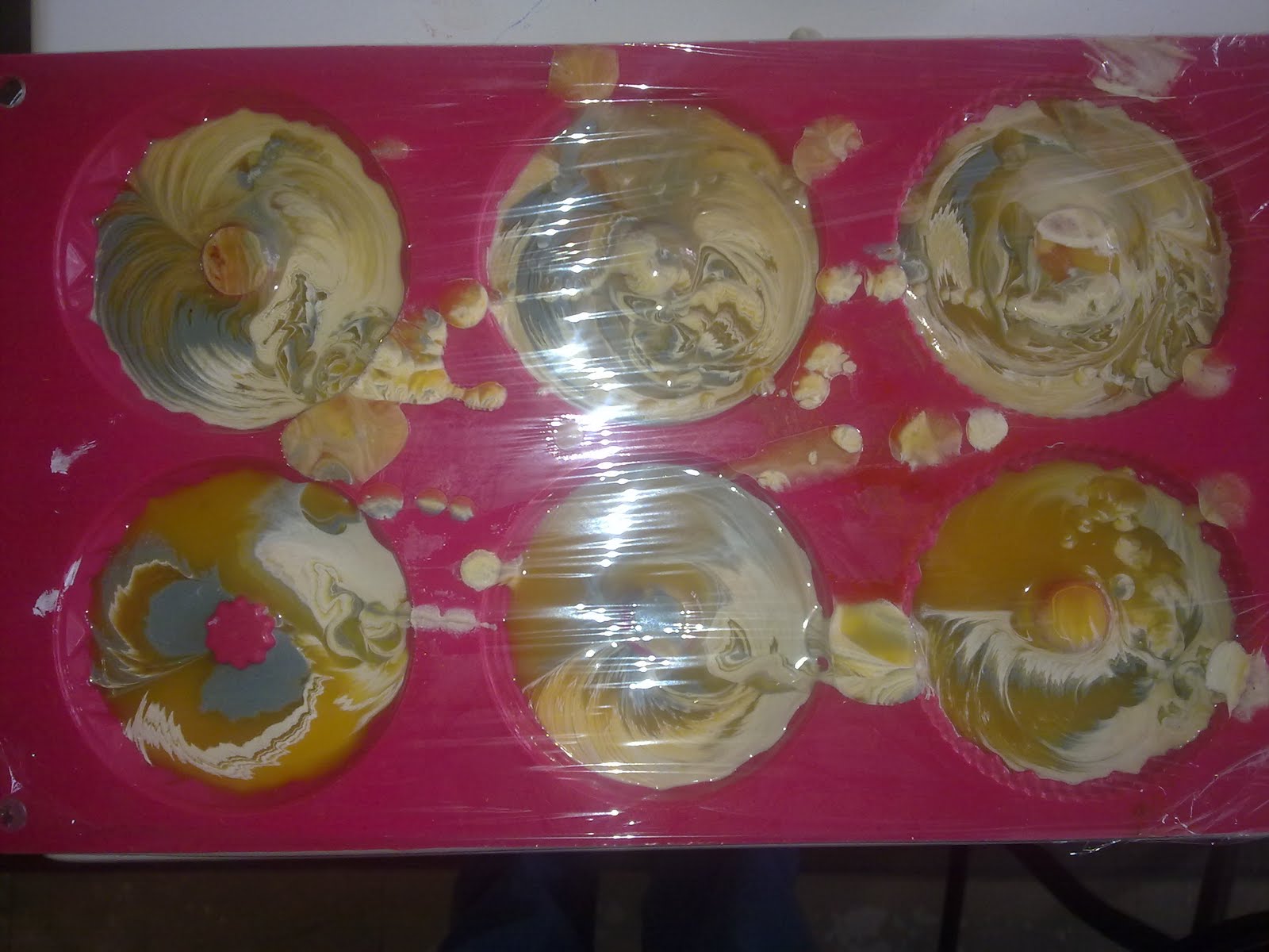 Ensuite, je verse le contenu dans tous les moules. Les filles sont heureuses de voir comment le hasard dessine la surface des savons. Avec le bout le plus fin d'une cuillère, je leur montre comment faire un marbrage en surface. Et je les invite à faire de même sur certains savons. D'autres resteront tels quels, déjà très jolis, grâce au hasard. Et après, mission isolation. Les moules sont recouverts de cellophane puis plus tard d'une serviette pour garder la chaleur et favoriser la saponification.