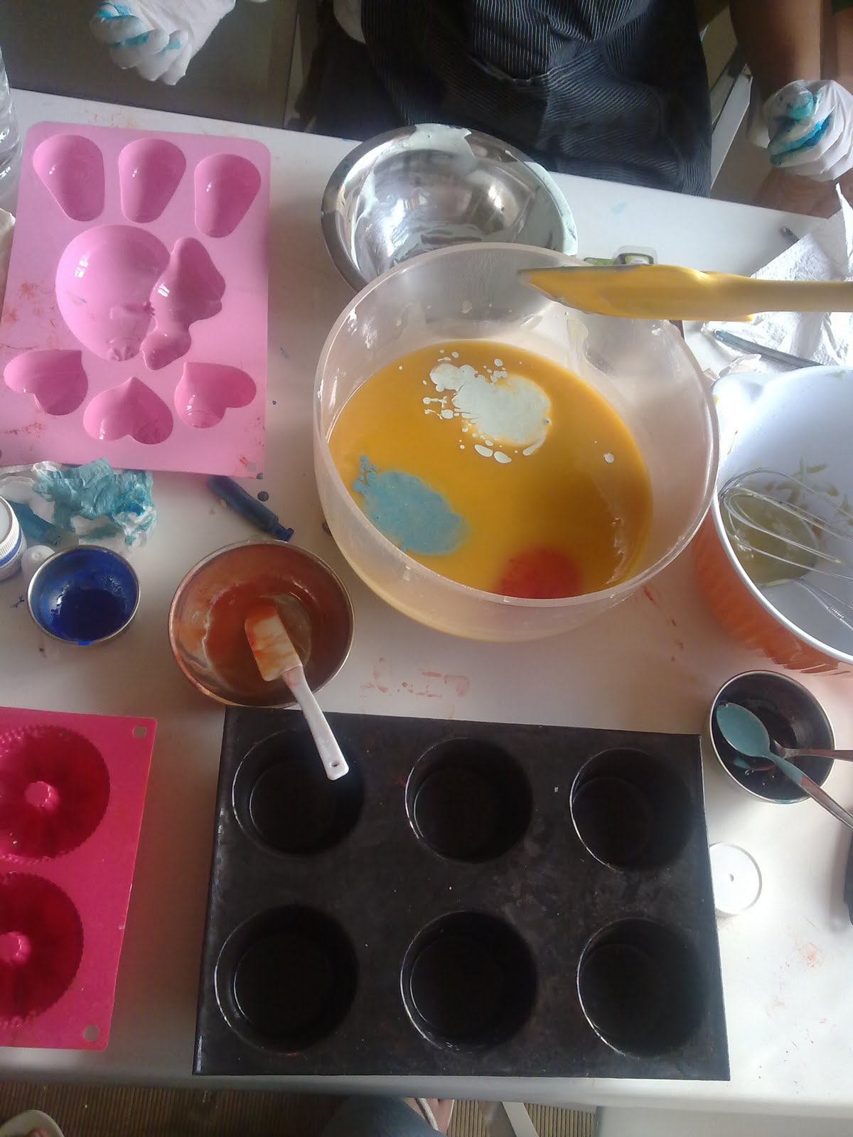 Nous voilà donc chez cette chère voisine, dans sa cuisine... Avec tout l'attirail : les huiles, les beurres, la soude caustique, l'eau, les colorants alimentaires (test du jour), les oxydes minéraux (au cas où), des arômes alimentaires, les récipients, les moules, les spatules, les gants, ... Mais aussi pas loin le vinaigre d'alcool (en cas de projection sur la peau, il neutralise la soude caustique), une pêche, du miel, de la crème fraîche, une banane et je ne sais plus trop quoi comme ingrédient à ajouter, parmi lesquels les filles devront choisir...