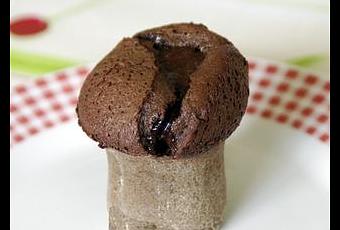 Dans tes moules, verse la pâte à mi-hauteur, pose deux carrés de chocolat, recouvre de pâte et passe le tout au frigo 20 mn.