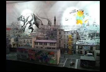 Ce soir-là, j’y allais pour la danse et j’ai trouvé une ville, sorte de plan relief urbain, dont les maquettes sont des photos, et dont la grisaille s’est animée au gré des couleurs des graffeurs invités. Dans le couloir près de l’entrée de la salle de spectacle, quelques photos saisissent des friches, des espaces industriels, et autres squats (photo Thias). Expositions réalisées par le PGC, PhotoGraff Collectif, « photographes-shooteurs de graffitis, pochoirs et autres arts graphiques de rue » comme ils se définissent. Le PGC gère aussi la Galerie Frichez nous la paix, 22bis rue Denoyez, à Paris, ouverte tout le mois de juillet.