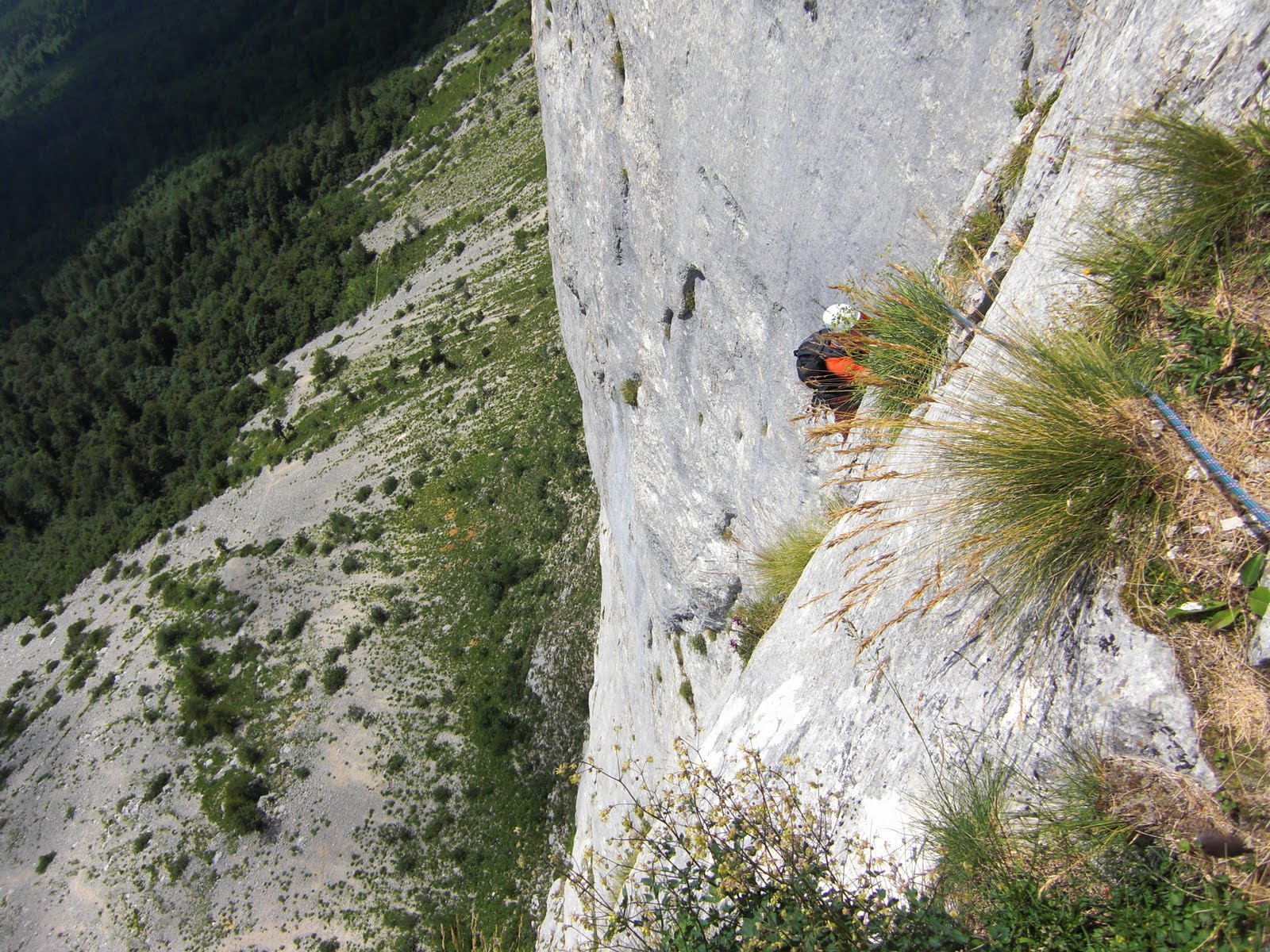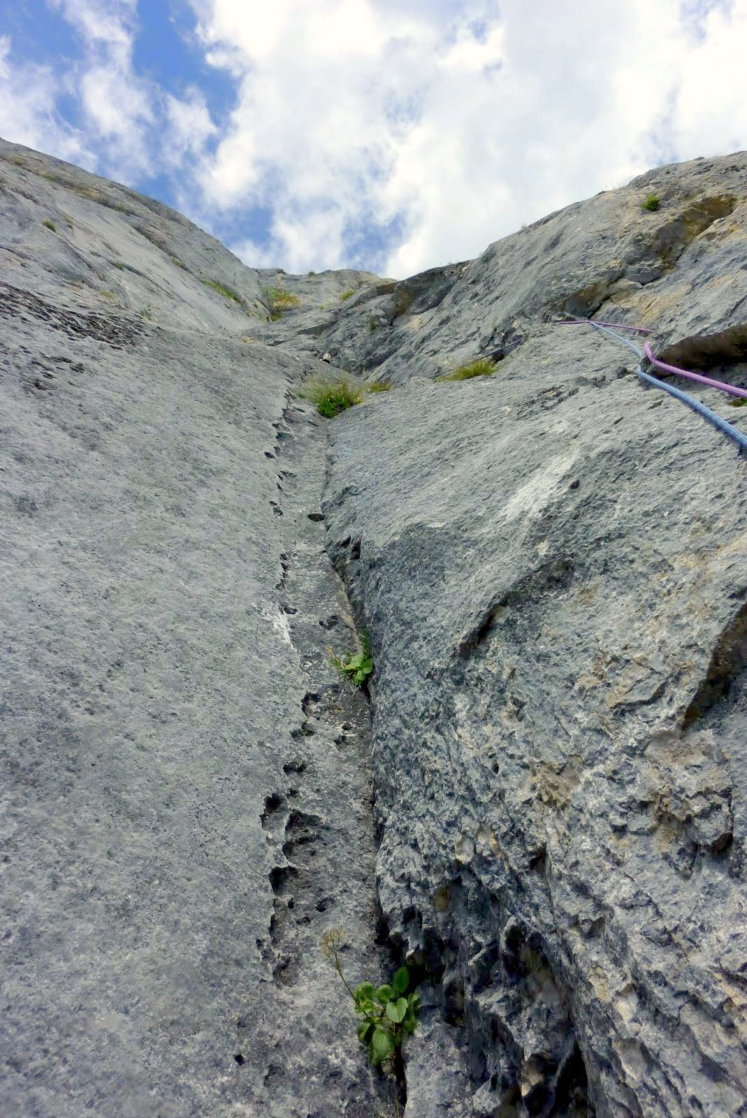 Ca y est, on y est ! Let’s go !On attaque par une dalle en 6a, puis c’est le début de la fissure. L2, 50m de fissure où il faut jardiner un peu au départ puis + on monte + c'est raide, 6b. J’enchaine L3+L4, 6b-6a, 50m de dalle puis fissure, c’est raide, c’est lisse, c’est dément. Relais dans une grotte, on se pause 5min, les 4 premières longueurs étaient majeurs.