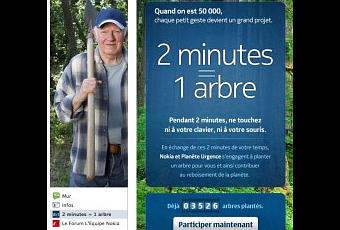 Nokia a décidé de s’engager pour le Développement Durable au sein du programme « Environnement et Développement » au côté de Planète Urgence. En échange de ces fameuses deux minutes, un arbre (maximum 3 par personne) sera replanté en Indonésie, où des actions de restauration des zones de mangroves dégradées sont menées quotidiennement, et l’internaute contribuera ainsi au reboisement de la planète.