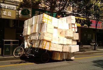 Je vous présentais ici les « Totems » d’Alain Delorme, montages photo réalistes de ces Chinois transportant des chargements improbables à pied, à vélo, en camion ou en tricycle. Et même si ces totems sont volontairement exagérés, ils ne sont pas forcément loin de la réalité.