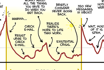 Loin de nous l’idée de vouloir évoquer en nos colonnes des sujets fâcheux tels que le retour de vacances, mais il faut bien avouer que l’illustration qui suit tape dans le mille. N’allez pas essayer de nous fabuler : que le premier qui n’arrive pas à reconnaître son mode de pensée ici lève le doigt, nous serions bien curieux de savoir comment il fait pour ne pas penser à ses mails non lus quelques heures après être arrivé au bord de la mer (ou à sa destination choisie…) Bref..