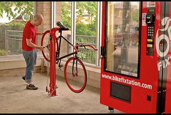 Bike Fixtation permet aux cyclistes de regonfler leur pneus gratuitement et met à disposition les outils necessaires pour effectuer une reparation grace à une machine vending.