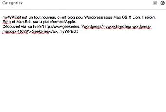 Découvert via Geekeries. myWPEdit est un tout nouveau client blog pour WordPress sous Mac OS X Lion. Il rejoint donc Ecto et MarsEdit sur la plateforme d’Apple.