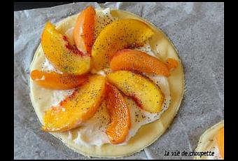 Pour 3 personnes : 3 abricots - 2 pêches - 1 rouleaux de pâtes à pizza - 3 c à s de mascarpone - 60g de sucre en poudre - graines de pavot.