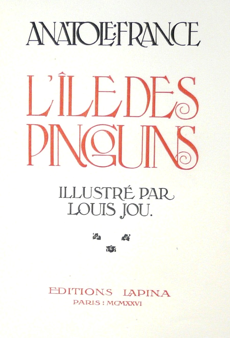 Leur collaboration s'exprime ici dans L'île des Pingouins, chez Lapina, 1926, 2 vol in4. Illustré par Louis Jou de 20 pointes-sèches originales hors texte et de 131 dessins en couleurs gravés sur bois par l'artiste.