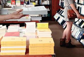 Passons cette première réaction et creusons d’abord sur la forme de l’affiche : on voit une jeune femme (petite parisienne bobo sur les bords), cheveux attachés, bien sous tous rapports, entourée de livres (grands formats bien sûr) qui tend le bras vers un livre, quand soudain, la main de Dieu (??), non du libraire est tendue vers elle avec un magnifique pavé de 1000 pages tout blanc. Wow! Ouais en effet ça décoiffe!