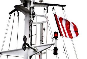Ce pavillon rayé rouge et blanc à bord du Malin signale que le bateau est en arrêt technique et/ ou indisponible pour l'appareillage... bâtiment sans équipage, Marine Nationale . Non ! il ne s'agit pas d'un signal fantaisie spécifiant que L'interdiction de fumer à bord a été levée !!! comme le disait la rumeur...