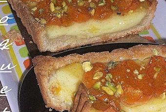 après cuisson badigeonner la tarte avec une gelée de coings chauffé et parsemer de pistaches concassés.