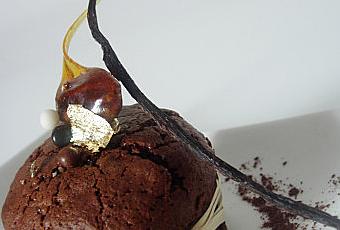 Pour la décoration, j'ai disposé une noix de pécan caramélisée, de la feuille d'or alimentaire et quelques billes de céréales au