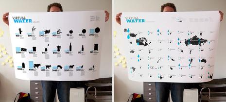 Grâce à une belle affiche, le (web) designer allemand Timm Kekeritz a illustré à partir de l’étude “Water footprints of nations” (de A.K. Chapagain et A.Y. Hoekstra) parue 2004, les consommations en eau potable des principaux pays du monde ainsi que la quantité d’eau nécessaire à la fabrication des mets que nous consommons couramment.