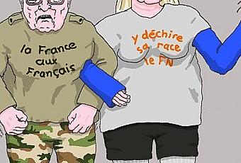 Pour résumer, nous avons ici deux versions du FN : Jean-Marie et Marine; mais, c'est kif-kif bourricot même si Marine fait des efforts pour paraître plus proche des classes populaires (d'où le texte sur son tee-shirt).
