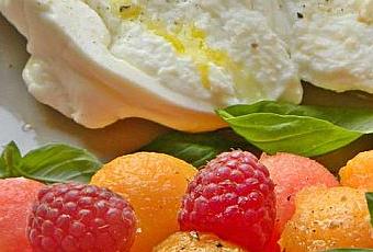 * Déposez une moitié de Burrata dans chaque assiette, les billes de fruits, quelques framboises. Arrosez d'huile d'olive. Parsemez de fleur de sel. Un tour de poivre de moulin. Quelques feuilles de basilic.