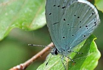 Le revers des ailes est bleu très pâle, constellé de petits point noirs.