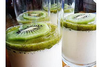 Mixez les kiwis avec le zeste de citron, le sucre et la menthe et versez sur les panna cotta et dégustez, c'est un dessert bien frais qui plaît beaucoup