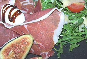 Dressez la roquette, puis les tranches de jambon, décorez de copeaux de Parmesan et de tomates cerises.