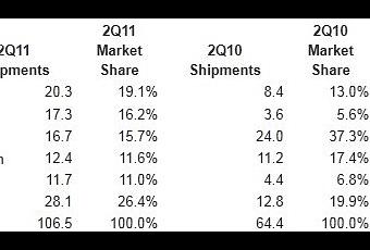 Aprés le Top5 des constructeurs de téléphones, voici celui plus spécifique des smartphones sur le second trimestre 2011 dans le monde. Si Nokia est un fragile leader dans le premier, il a été rétrogradé en troisième place dans le second ! En effet, selon IDC, Apple est le numéro un aussi bien en nombre d’appareils vendus (20,3 millions) qu’en part de marché (19,1%), mais il est talonné de prés par Samsung et ses 17,3 millions de terminaux écoulés lui offrant une part de marché de 16,2%. RIM et HTC sont respectivement quatrième et cinquième.