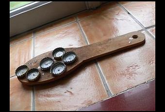 Bon, je ne vais pas vous laisser mariner longtemps comme une viande destinée à être cuite à la plancha. Ceci est un outil à écailler les poissons, fabriqué par mon père avec une planchette de contreplaqué, des clous et des capsules de bière...D'ailleurs, il a "perdu une dent" lors de sa dernière utilisation...