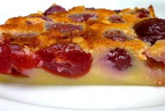 Laver, équeuter et dénoyauter les cerises (moi je préfère!). Disposer les dans un plat préalablement beurré et verser la pate liquide sur les cerises. Parsemer la surface de noisettes de beurre.
