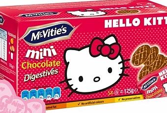 Disponibles en Allemagne depuis juillet , voici les biscuits Mc Vitie's mini Hello Kitty ! Ces biscuits au blé croustillant et nappés de chocolat sont vendus dans une boite qui contient 5 sachets de 25 gr ! On trouve les biscuits Mc Vities un peu partout dans le monde , chez nous cette marque est présente depuis l'an dernier il me semble , mais aux dernières nouvelles les biscuits Hello Kitty ne sont pas disponibles en France , peut-être que ça viendra qui sait ? Prix conseillé 1.69 € environ en Allemagne