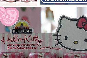 En Allemagne , la marque Mühlhäuser propose depuis quelques semaines un pack de trois petits pots de confitures ( 3 x 28 gr ) à l'effigie d'Hello Kitty ! Il existe au total 12 pots différents ... Une chose est certaine , j'ouvrirais l'oeil lors de mes prochaines courses en Allemagne ! Source dernière image: Hellokittymuseum.com