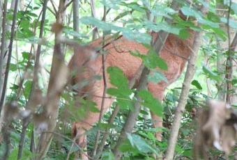 Pourtant, à cœur vertueux tout est possible. Alors que je trottais dans une allée gazonnée rendant mon pas silencieux, l’œil rivé sur les floraisons en quête d’un insecte photogénique, un craquement court et sec attire mon attention vers l’intérieur des fourrés. Une bête d’un fauve clair vient de bouger avant de s’immobiliser, l’instinct du chasseur me pousse à l’imiter, seuls mes yeux s’agitent, scrutant les taillis sous les arbres. Enfin je l’aperçois, je la devine devrais-je dire. Cachée derrière les jeunes troncs et les feuilles vertes, elle m’observe tandis que j’arme et la shoote au jugé et dans la précipitation, de peur de la manquer une fois encore. Puis elle se détourne sans hâte aucune et s’éloigne dans la direction opposée, indifférente de mon sort, me laissant frustré à nouveau, cette fois-ci j’étais très proche, cette fois-ci j’avais mon appareil photo, mais cette fois-ci elle ne m’a jamais laissé voir son visage et ses yeux.