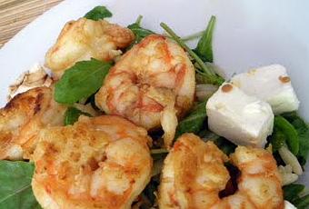 Incorporer la roquette au mélange légumes, répartir sur les assiettes , garnir de crevettes et parsemer de feta, servir de suite encore tiède.