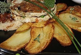 Sur des tranches de pain, déposer la vinaigrette à la tomate puis disposer les pommes de terre dorées.