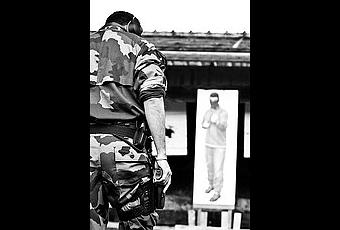 Séance d'entrainement au tir. L'arme utilisée est un SIG Sauer SP 2022 en calibre 9mm. Ici le gendarme vêtu d'un treillis se concentre pour faire mouche sur une cible CIMAD. Chargeur engagé, le coup de feu est imminent.
