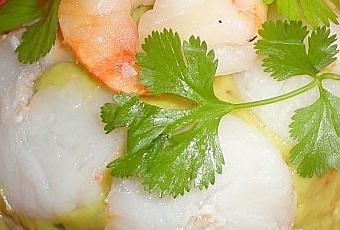 Couper les avocat en deux, retirer les noyaux et mixer la chair avec le jus des citrons et la sauce nuoc-mâm, y incorporer la purée de piment et les morceaux de gambas et ajouter quelles feuilles de coriandre ciselées.