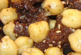 Egoutter les pois chiches. Les rincer à l’eau claire. Egoutter à nouveau. Les ajouter dans la poële. Bien remuer.