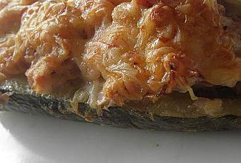 Garnir les courgettes de la préparation sur la longueur, recouvrir de gruyère rapé et cuire à 200° jusqu'à ce que le gruyère soit bien doré.