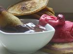 Servez vos pancakes nappez de la sauce chocolat accompagné d'un sorbet framboise. Voir même pour les plus gourmands (es) un soupçon de chantilly. Après cela .....