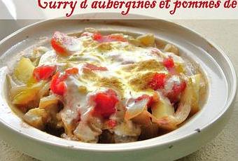 Dans une sauteuse faire suer les oignons dans une cuil d'eau puis ajouter les pommes de terre, les aubergines et l'ail pilé. Laisser cuire une dizaine de minutes puis verser les tomates et le curry. Saler et poivrer. Finir de cuire encore quelques minutes puis couper le feu.