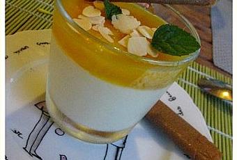 Laisser refroidir un peu , poser une tranche de mangue sur la pannacotta puis verser la gelée de mangue.