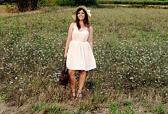 Robe : H&M, Capeline : André, Chaussures : ? Sac : Miu Miu.