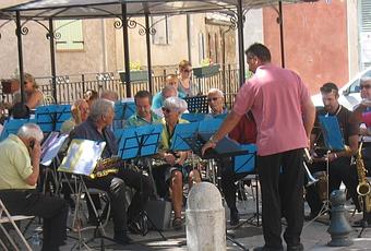 Les Ampusians s'étaient donné rendez-vous sur la Place de la mairie pour l'apéritif auquel ils avaient été conviés. A côté du kiosque s'était installé un orchestre de Fréjus, avec de nombreux musiciens , pour accompagner les agapes que la municipalité nous avait mitonnées. Des crudités , de l'anchoïade, de la boisson variée. J'ai bu du rosé-pamplemousse : je vous recommande cette boisson délicieuse avec des champignons crus assaisonnés d'anchoïade.