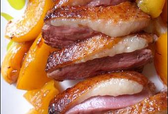 Sortir du feu et découper le magret. Servir accompagné des pêches; dégustez!