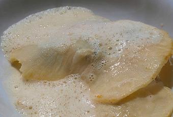 Il a été épluché, puis coupé en fines tranches à la mandoline. Je ne me suis servi que de la moitié. L'autre à servi ICI. Il faut ensuite se dépêcher de les cuire, car elles risquent de s'oxyder.
