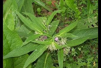 La consoude ou grande consoude est une plante vivace, aux multiples vertus. On utilise essentiellement les feuilles et les racines. Ses feuilles sont d’un vert assez clair et de taille moyenne. Elles ressemblent à des oreilles d’âne, d’où son surnom « oreilles d’âne ». On l’appelle aussi langue-de-vache, ou sole végétale (elle a un goût de poisson). Elle produit des fleurs, en grappe, de couleur violet, blanc ou rose. Elle pousse dans les milieux humides, aussi bien en Europe qu’en Asie. Les Grecs l’utilisaient déjà. Elle était préconisée pour soulager les hémorroïdes, notamment.