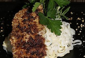Préparer le poisson pané : passez-le dans la farine puis l'oeuf battu et enfin la poudre de noisettes.